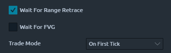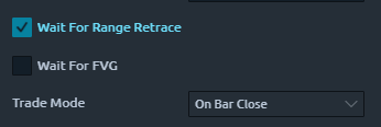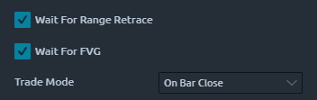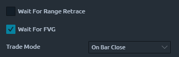 Wait For FVG | This option will make the strategy wait for a valid Fair Value Gap while breaking from the range. The FVG can occur after the breakoff. When this option is not used, the strategy will only wait for a bar close in the direction of the trade |